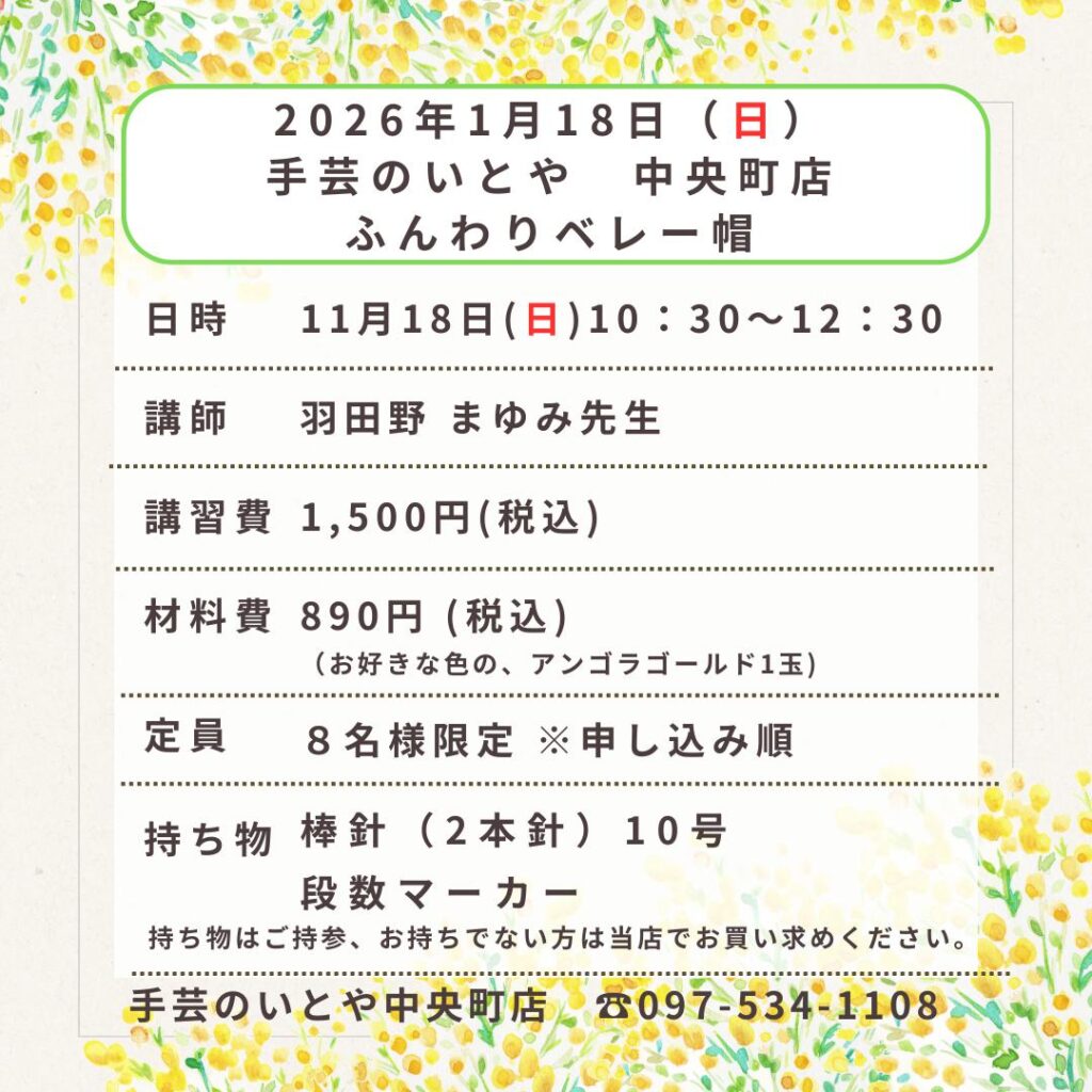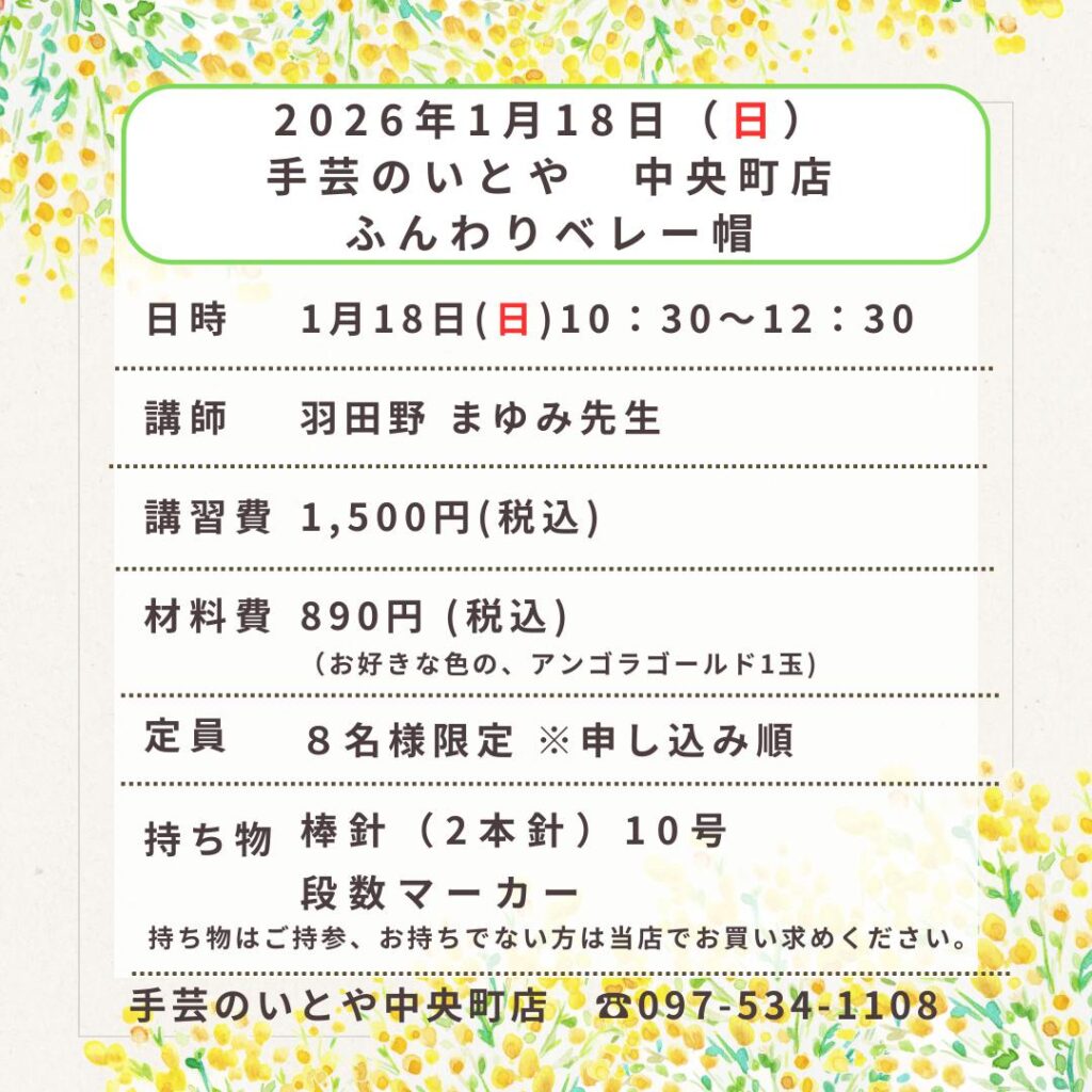 中央町店 1月18日(日)羽田野先生の特別講習会「ふんわりベレー帽」