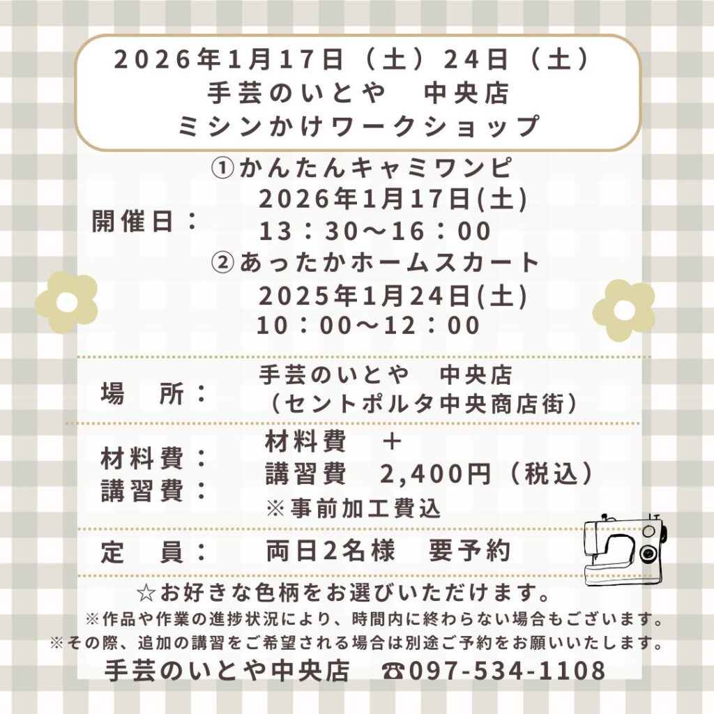中央町店 1月24日(土)ミシンかけワークショップ 「あったかホームスカート」