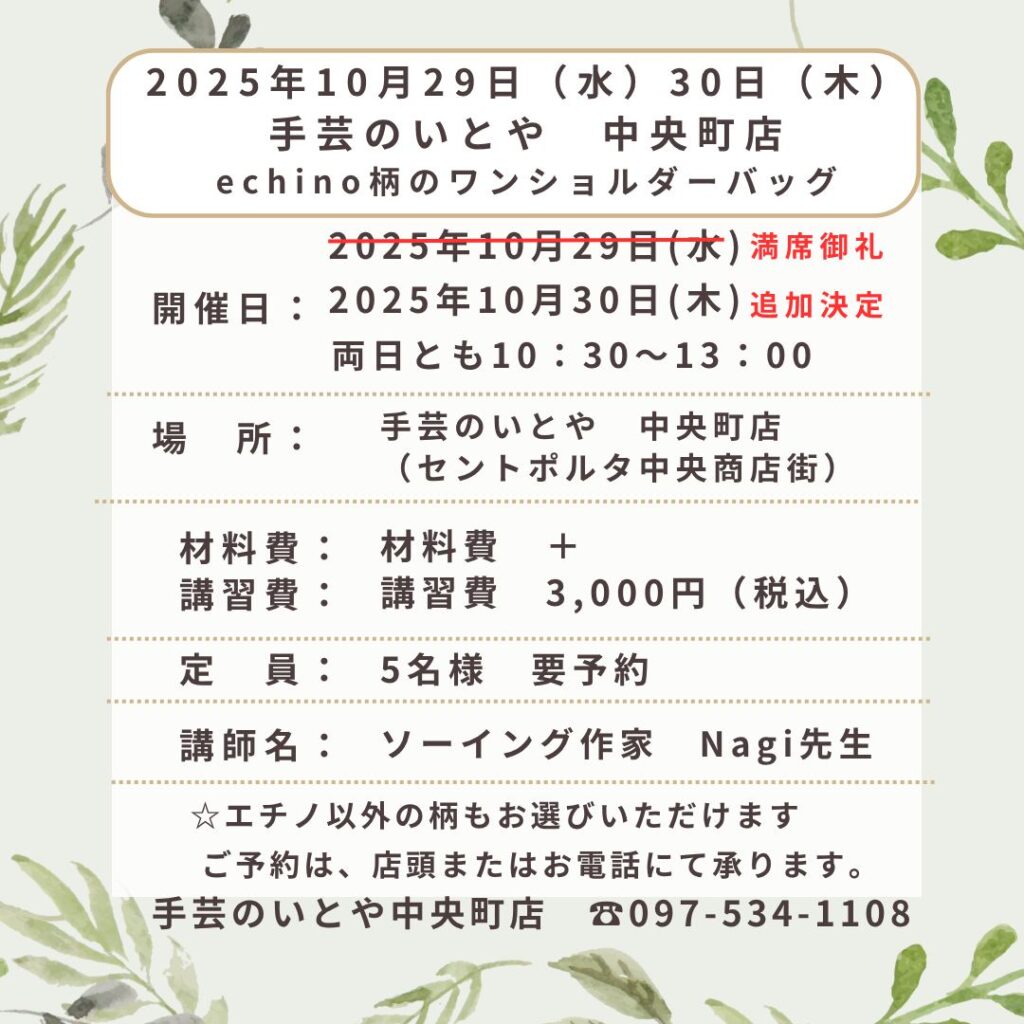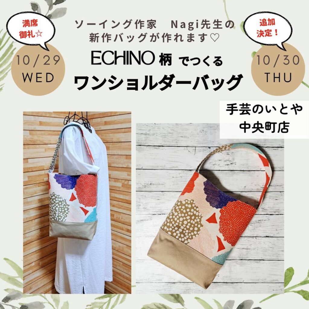 中央町店 10月29日(水)30日(木)Nagi先生の特別講習会 echino柄でつくるワンショルダーバッグ