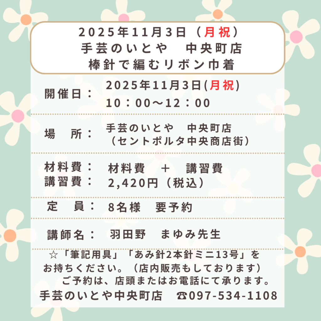 - 持ち物:筆記用具 あみ針2本針ミニ13号(店内でも販売しております)