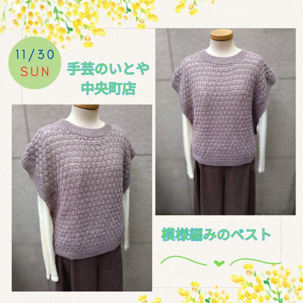 中央町店 11月30日(日)羽田野先生の特別講習会「模様編みのベスト」