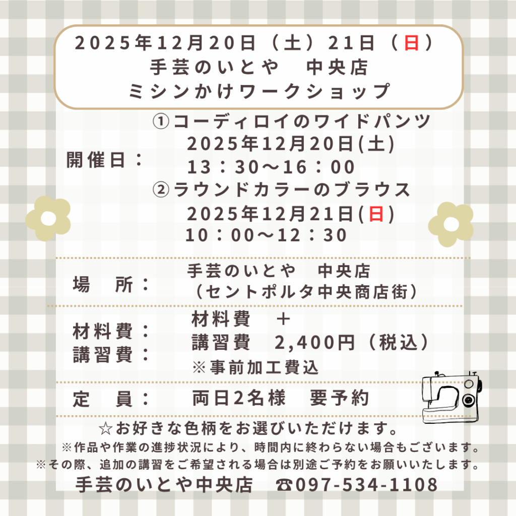 中央町店 12月20日(土)ミシンかけワークショップ 「コーディロイのワイドパンツ」