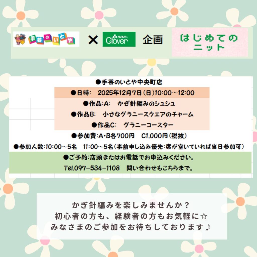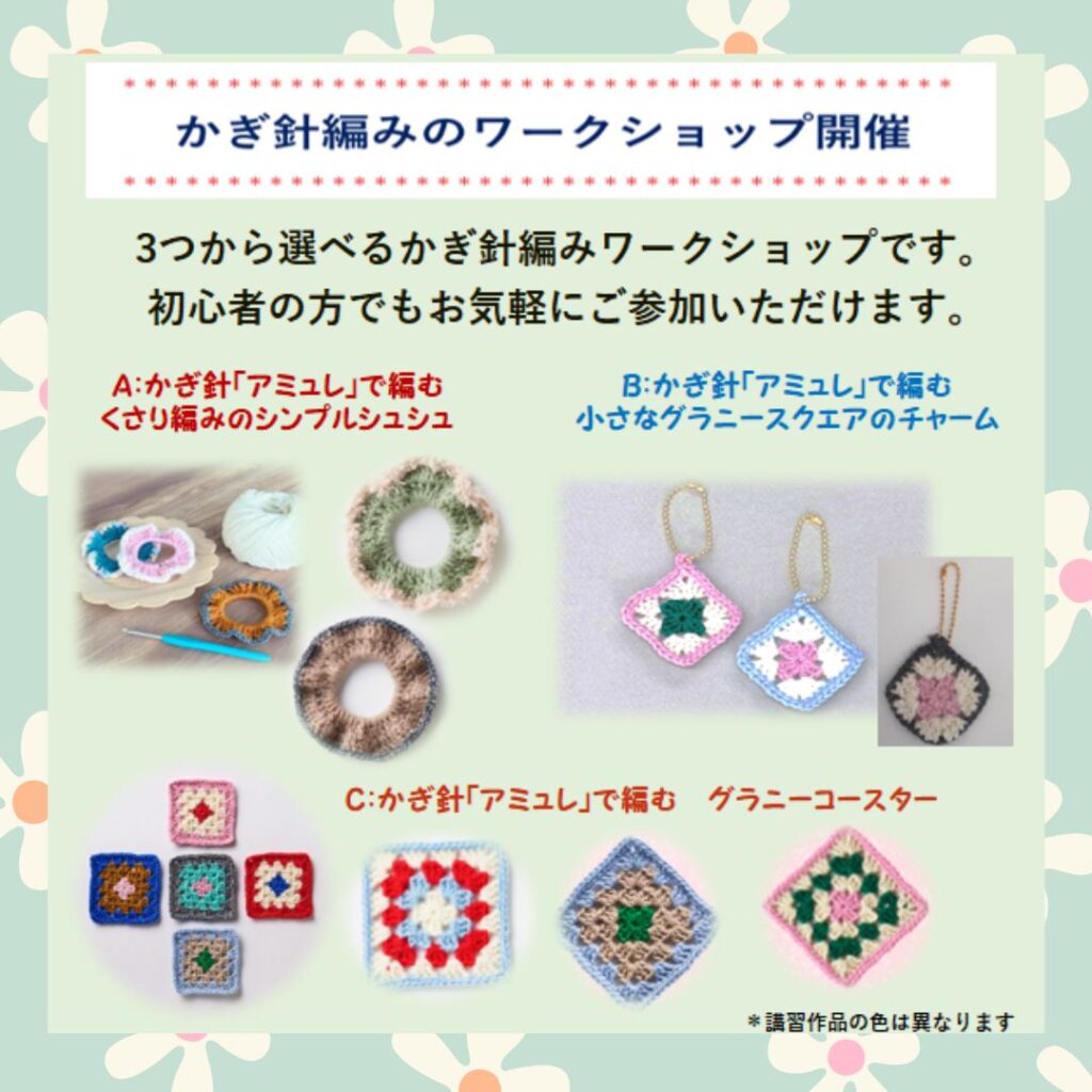 【手芸のいとや中央町店より】クロバー企画!「かぎ針編みのワークショップ」の講習会を羽田野まゆみ先生を講師にお迎えし開催いたします!3つから選べるかぎ針編みワークショップです。かぎ針初心者さんもお気軽にご参加ください。もちろん経験者の方も大歓迎です☆みなさまのご来店をお待ちしております♪
