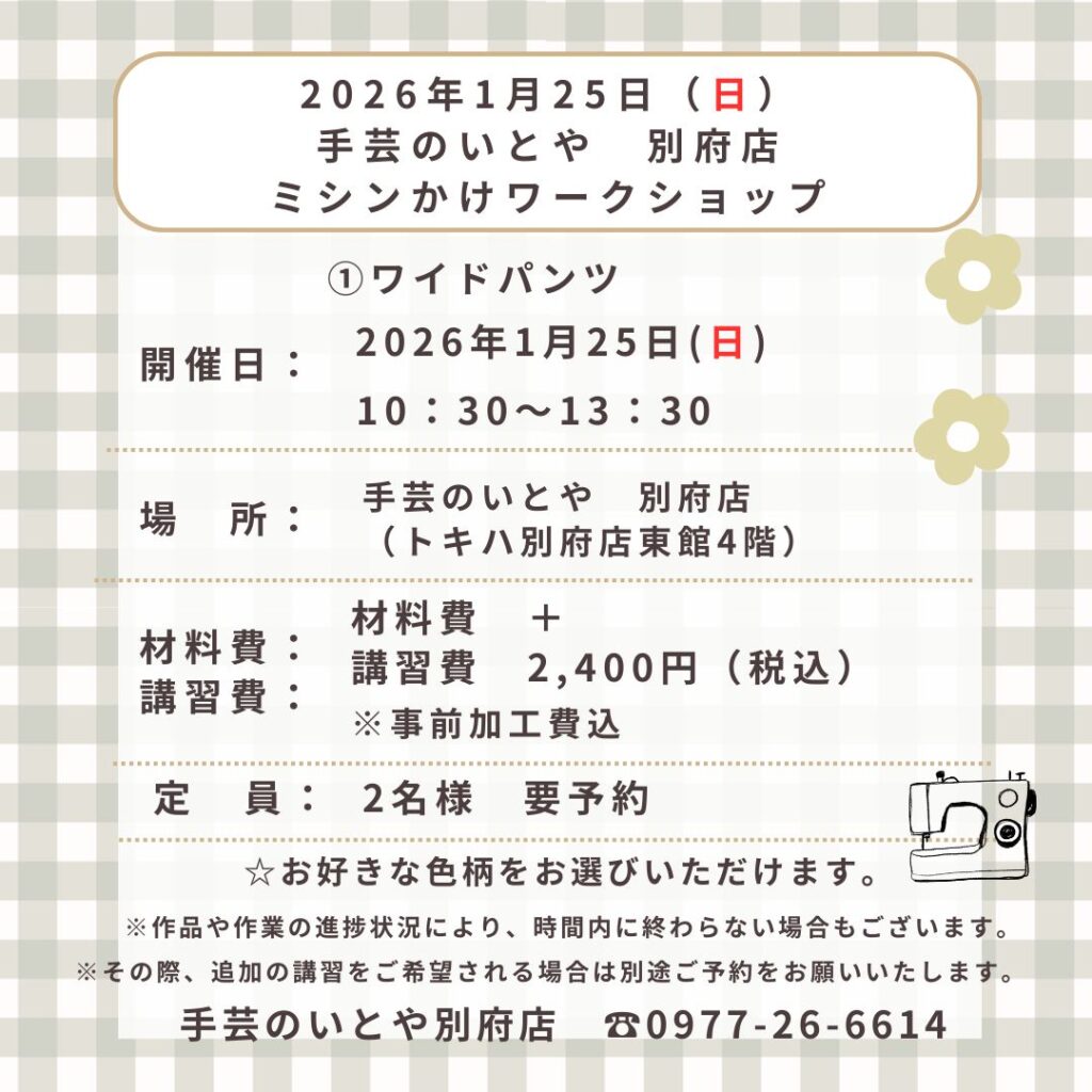 別府店 1月25日(日)ミシンかけワークショップ 「ワイドパンツ」
