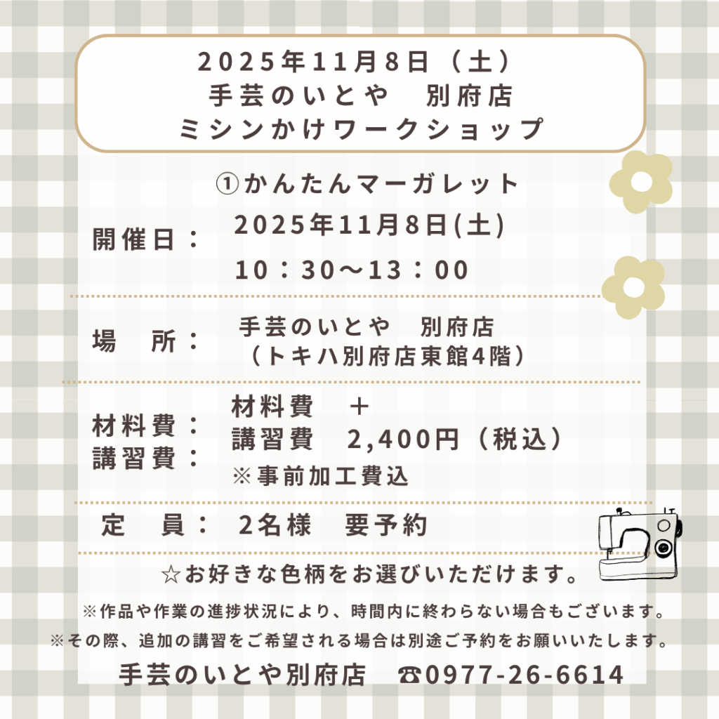 別府店 11月8日(土)ミシンかけワークショップ 「かんたんマーガレット」