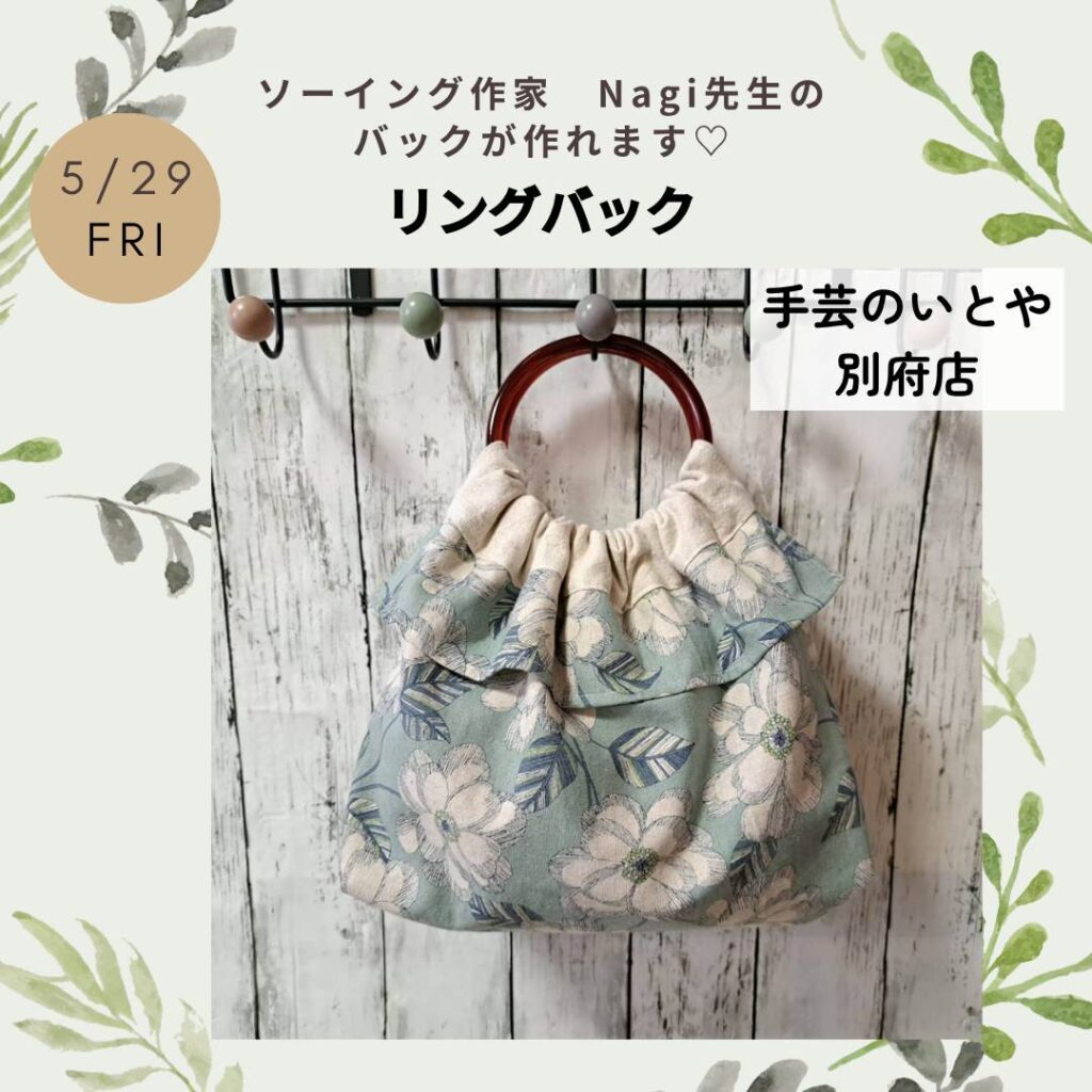 【手芸のいとや別府店より】5月29日(金)にて!ソーイング作家Nagi先生の講習会を開催いたします♪今回の作品は「リングバック」です☆ふんわりとしたフォルムがエレガントなバック♪おでかけを彩るステキなバックをつくりませんか?生地の色や柄はお好みのものをお選び頂けます。みなさまのご参加をお待ちしております♪