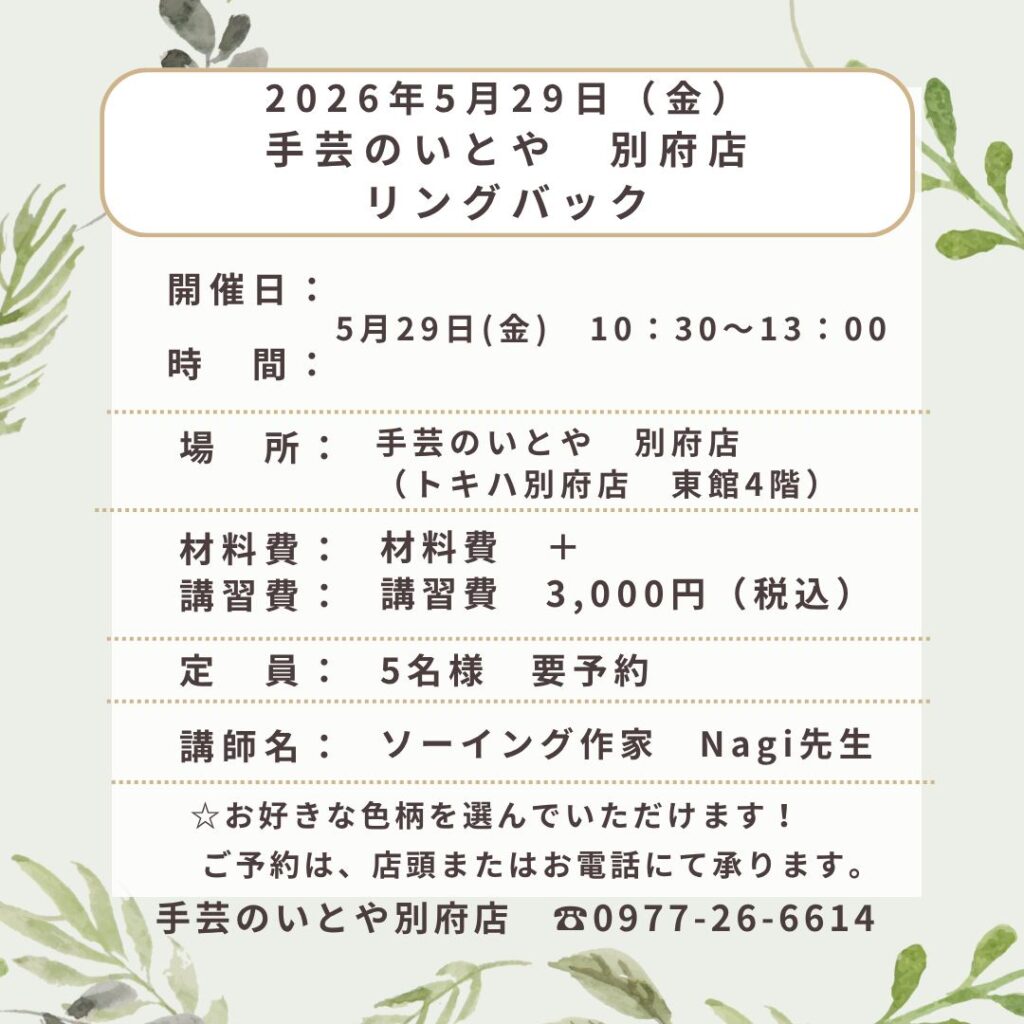 • 場 所:手芸のいとや 別府店 (トキハ別府店東館4階)