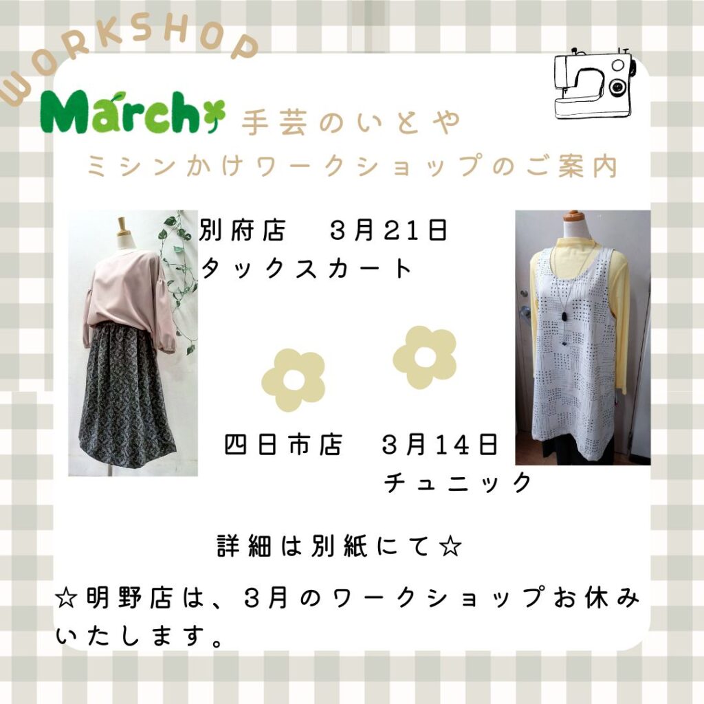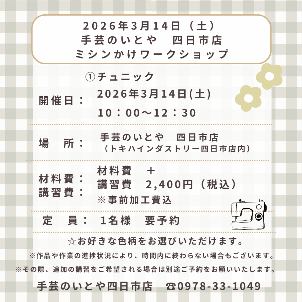 四日市店 3月14日(土)ミシンかけワークショップ 「チュニック」