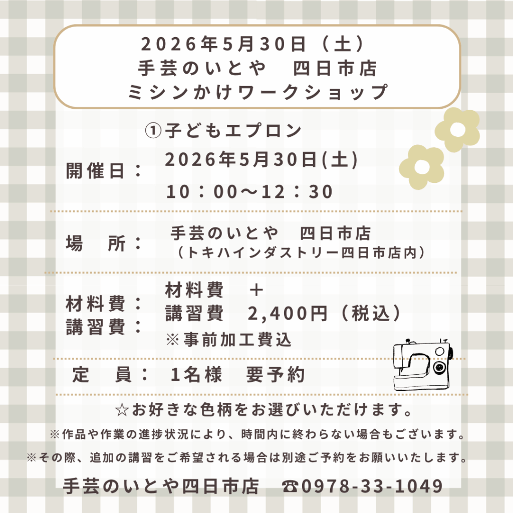 四日市店 5月30日(土)ミシンかけワークショップ 「子どもエプロン」