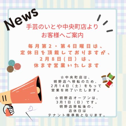 【中央町店よりご案内】2月8日(日)は休まず営業いたします