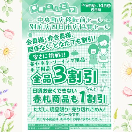 2月9日(月)から14日(土)の6日間開催!手芸のいとや中央町店移転前セール...