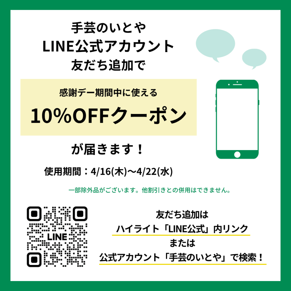 4月16日(木)から4月22日(水)までの7日間!手芸のいとや【お客様感謝デー】を開催致します!期間中は会員様でない方にもLINEにてお得なクーポンを配信中♪