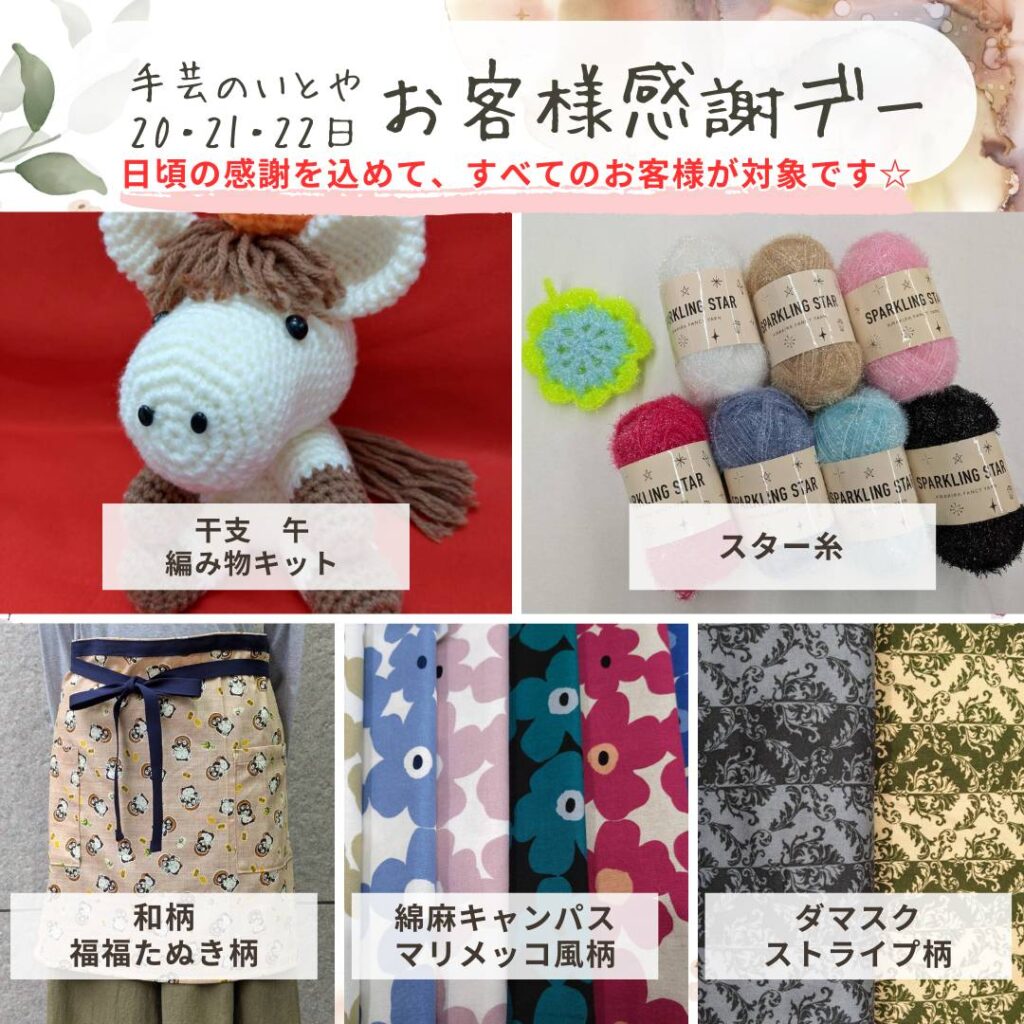 ・干支(午)編み物キット・キラキラがかわいい!スター糸・純毛並太、極太・和柄福福たぬき柄・綿麻キャンパスマリメッコ風柄・モルドール材料・和柄唐草模様・ダマスクストライプ柄など今の時期にぴったりな布地やキットがお買い得に☆在庫限りのため店舗により在庫状況が異なります。気になる商品はお早めに!