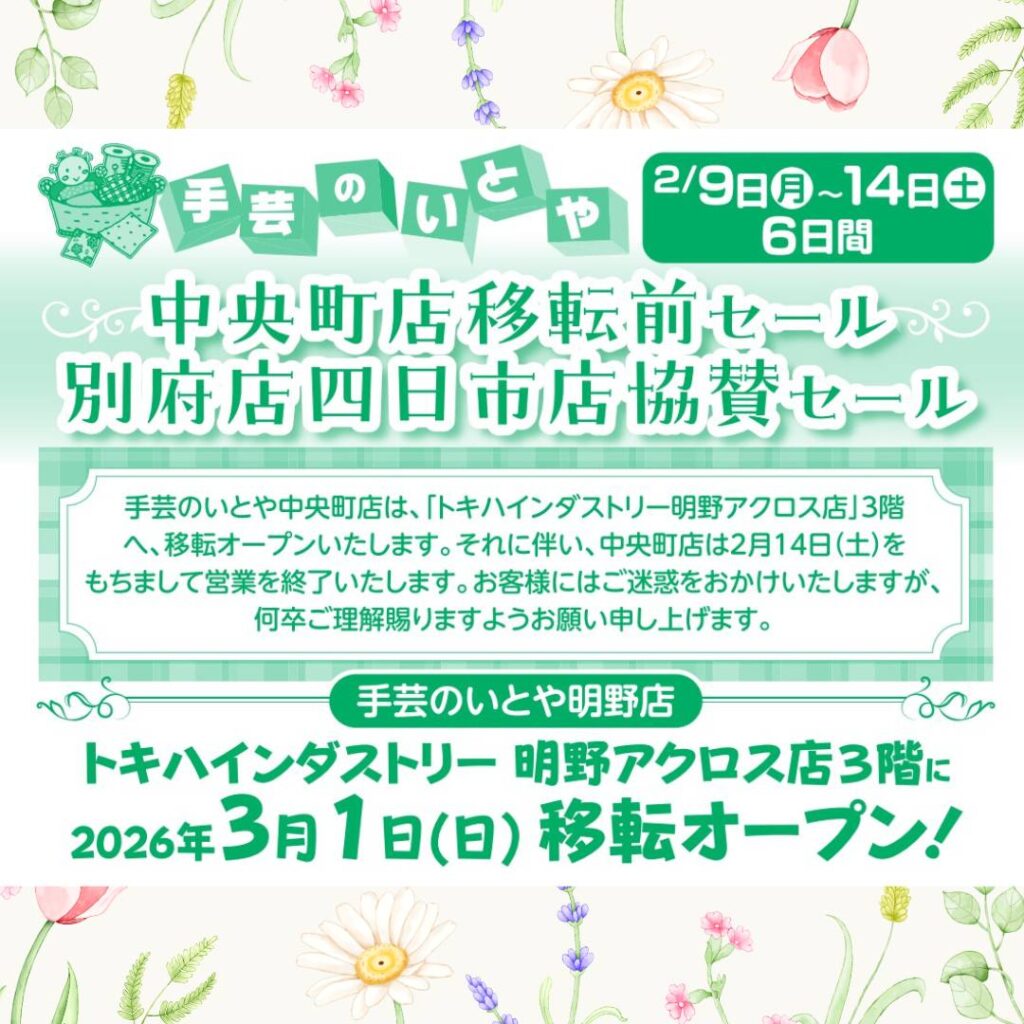 2月9日(月)から14日(土)の6日間開催!手芸のいとや中央町店移転前セール開催♪